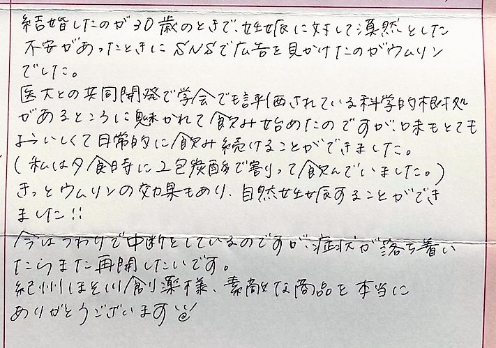 結婚したのが30歳のときで、漠然とした不安があったときにSNSで広告を見かけたのがウムリンでした。魅かれて飲み始めたのですが、味もとてもおいしくて日常的に飲み続けることができました。(私は夕食時に2包炭酸で割って飲んでいました。)今はつわりで中断をしているのですが、症状が落ち着いたらまた再開したいです。紀州ほそ川創薬様、素敵な商品を本当にありがとうございます☀