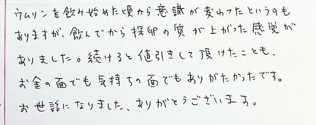 ウムリンを飲み始めた頃から意識が変わったというのもあります。続けると値引きして頂けたことも、お金の面でも気持ちの面でもありがたかったです。お世話になりました。ありがとうございます。
