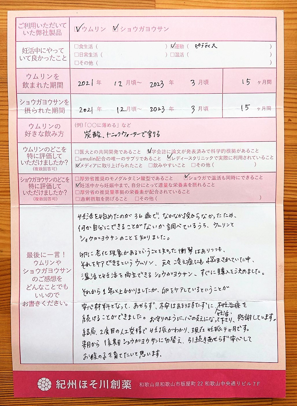 何か自分にできることがないか調べているうち、ウムリンとショウガヨウサンのことを知りました。すぐに購入を決めました。それから1年以上かかりましたが、安心材料となって、あせらず、不安はあまり持たずに、続けることができました。お守りのように、心の支えになって下さり、感謝しています来月から後期ショウがヨウサンに切替え、引続きあせらず安心してお腹の子を育てたいと思います。
