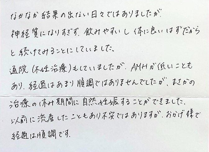 神経質になりすぎず、飲みやすいしと続けてみることにしていました。不安ではありますが、おかげ様で経過は順調です。