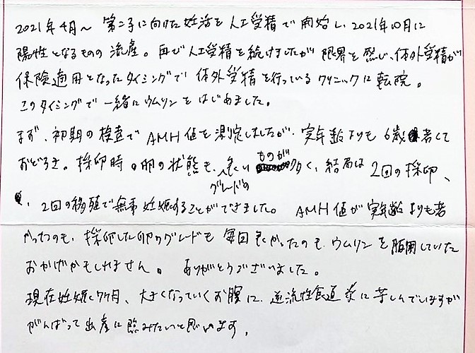ウムリンをはじめました。ありがとうございました。大きくなっていくお腹に逆流性食道炎に苦しんでいますががんばって出産に臨みたいと思います。