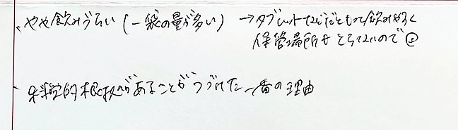 やや飲みづらい(一袋の量が多い)→タブレットなどだともっと飲みやすく保管場所も取らないので〇
