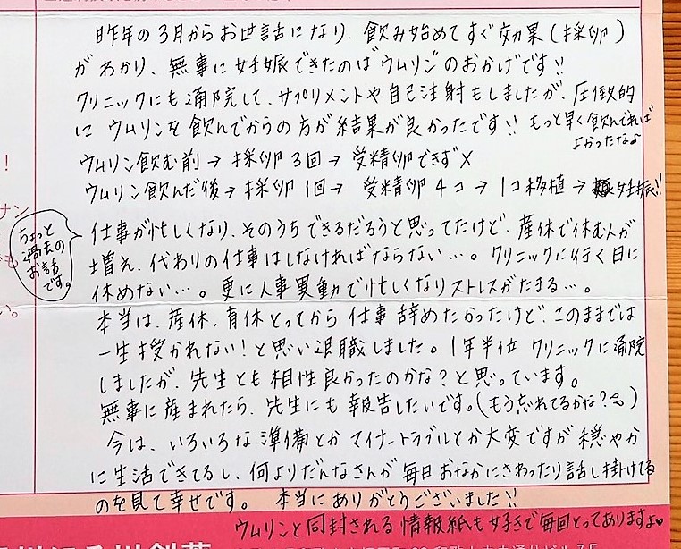 昨年の3月からお世話になり、もっと早く飲んでればよかったな♪ちょっと過去のお話です。ずっと、仕事が忙しくなり、そのうちできるだろうと思ってたけど、産休で休む人が増え、代わりの仕事はしなければならない..。クリニックに行く日に休めない…。更に人事異動で忙しくなりストレスがたまる…。本当は、産休、育休とってから仕事時めたかったけど、このままでは一生授かれない!と思い退職しました。今は、いろいろな準備とかマイナートラブルとか大変ですが穏やかに生活できてるし、何よりだんなさんが毎日おなかにさわったり話し掛けてるのを見て幸せです。本当にありがとうございました!!ウムリンと同封される情報紙も好きで毎回とってありますよ💛