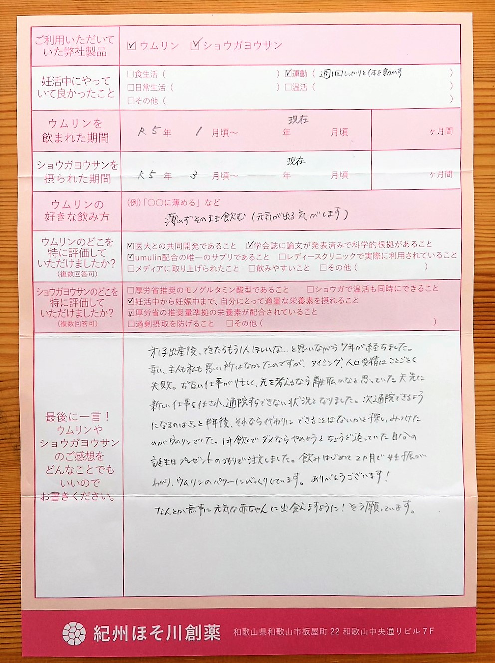 おたがい仕事が忙しく、先を考えるなら離職なのなと思っていた矢先に新い仕事を任され、できることはないかと探し、みつけたのがウムリンでした。ちょうど迫っていた自分の誕生日プレゼントのつもりで注文しました。ウムリンのパワーにびっくりしています。ありがとうございます!なんとか無事に出会えますように!そう願っています。
