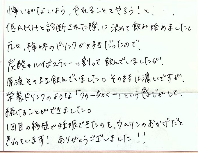 悔いがないよう、やれることをやろう!と決めて飲み始めました。元々、梅味のドリンクが好きだったので、炭酸やルイボスティーと割って飲んでいましたが、原液そのまま飲んでいました。そのままは濃いですが栄養ドリンクのような「クウー効くー」という感じがして、続けることができました。ありがとうございました!!