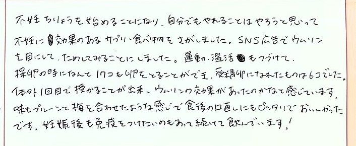 自分でもやれることはやろうと思ってサプリ・食べ物をさがしました。SNS広告でウムリンを目にして、ためしてみることにしました。味もプルーンと梅を合わせたような感じで食後の口直しにもピッタリでおいしかったです。妊娠後も続けて飲んでいます!