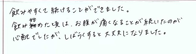 飲みやすくて続けることができました。飲み始めた頃は、お腹が痛くなることが続いたのが心配でしたが、しばらくすると大丈夫になりました。