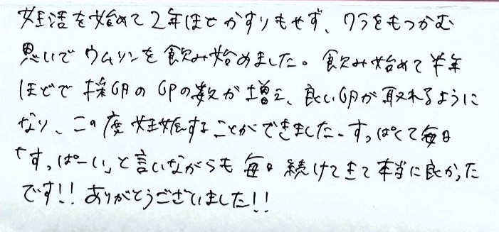 ワラをもつかむ思いでウムリンを飲み始めました。すっぱくて毎日「すっぱ~い」と言いながらも毎日続けてきて本当に良かったです!!ありがとうございました!!