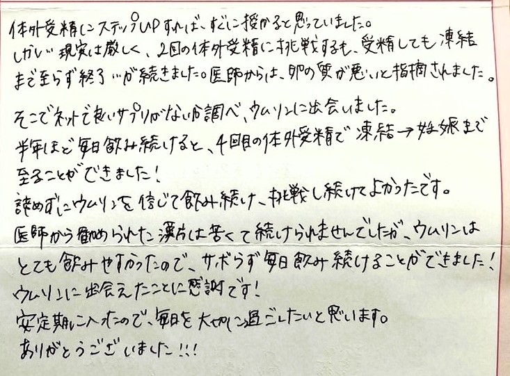 そこでネットで調べ、ウムリンに出会いました。諦めずに信じて飲み続け、挑戦し続けてよかったです。ウムリンはとても飲みやすかったので、サボらず毎日飲み続けることができました!ウムリンに出会えたことに感謝です!安定期に入ったので、毎日を大切に過ごしたいと思います。ありがとうございました!!!