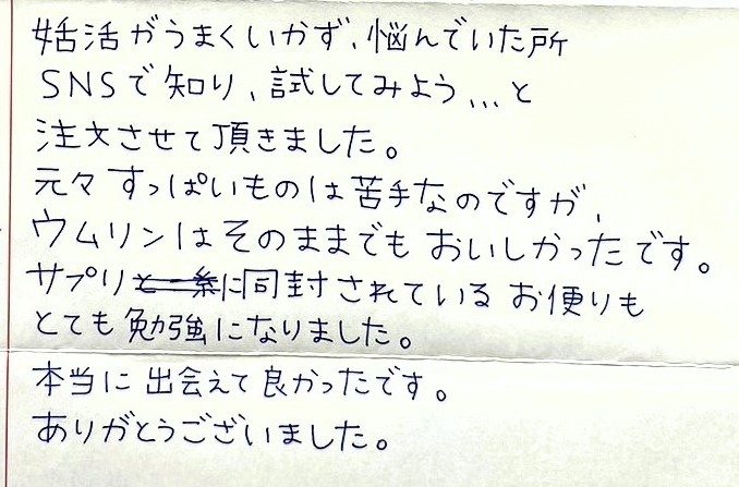 悩んでいた所SNSで知り試してみよう…と注文させて頂きました。元々すっぱいものは苦手なのですが、ウムリンはそのままでもおいしかったです。サプリに同封されているお便りもとても勉強になりました。本当に出会えて良かったです。ありがとうございました。