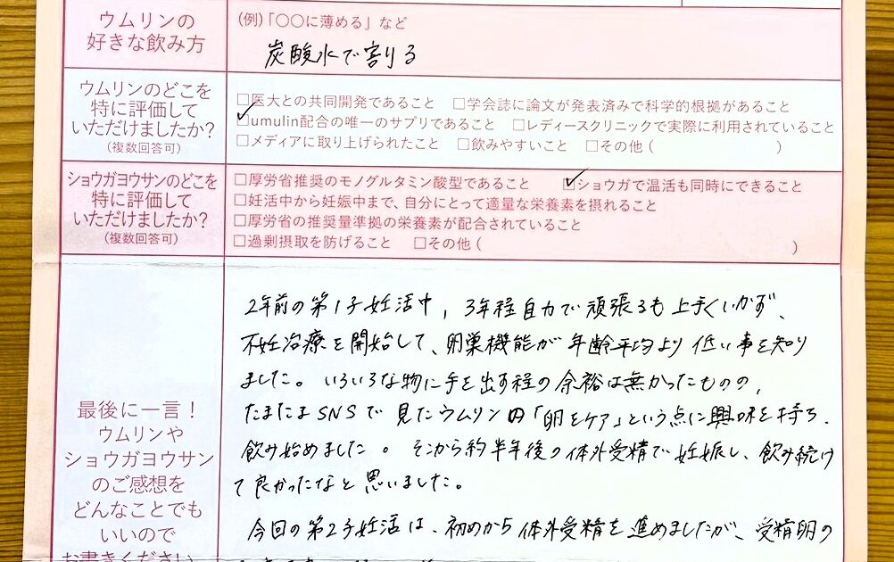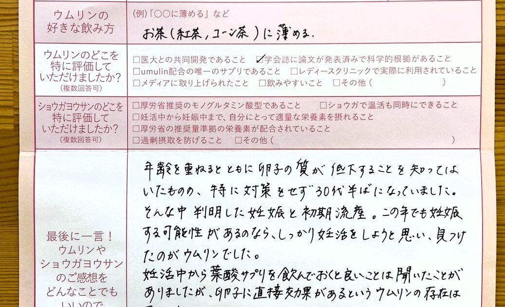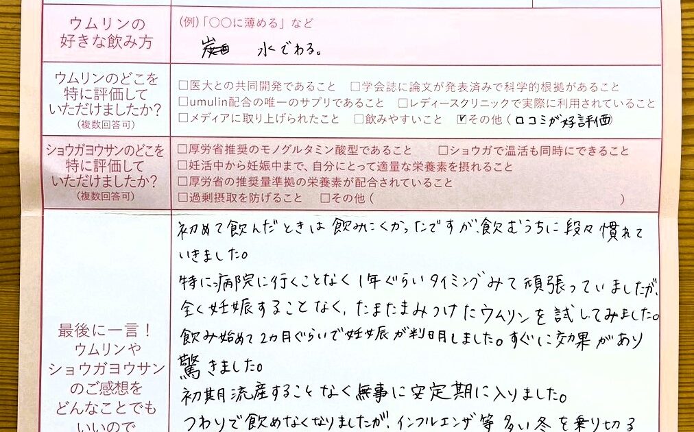 しっかりしようと思い、見つけたのがウムリンでした。ウムリンの存在は目からウロコでした。毎日朝に2本、お茶などに混ぜてウムリンを飲んでいました。まだまだ不安定な時期が続きますが、我が子に会えるのが楽しみです。