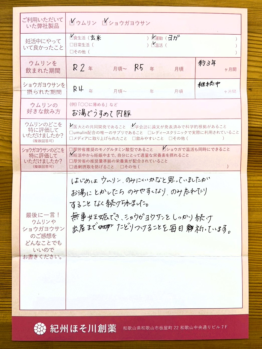 はじめはウムリン、のみにくいかなと思っていましたがお湯にとかしたらのみやすくなり、のみ忘れたりすることなく続けられました。ショウガヨウサンをしっかり続けたどりつけることを毎日祈っています。