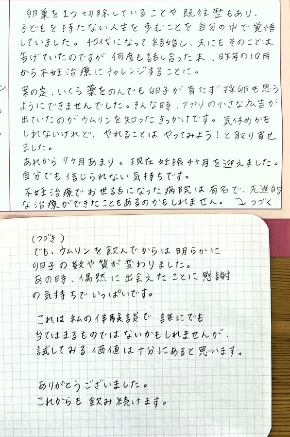アプリの小さな広告が出ていたのがウムリンを知ったきっかけです。気休めかもしれないけれど、やれることはやってみよう!と取り寄せました。自分でも信じられない気持ちです。あの時、偶然に出会えたことに感謝の気持ちでいっぱいです。これは私の体験談で誰にでも当てはまるものではないかもしれませんが、試してみる価値は十分にあると思います。ありがとうございました。これからも飲み続けます。