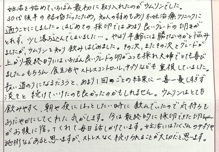 いちばん最初に取り入れたのがウムリンでした。悩みましたが、ウムリンを知り飲みはじめました。もちろん食生活やストレスコントロール、サプリなども重視していました。長い道のりになるだろうと、あまり1回のごとの結果に一喜一憂しすぎず淡々と続けていけたのも良かったのかもしれません。ウムリンはとても飲みやすく、朝や夜にほっとしたい時に飲んでいたので気持ちもおだやかにしてくれた気がします。ストレスなく続けられることが大切だと思います。