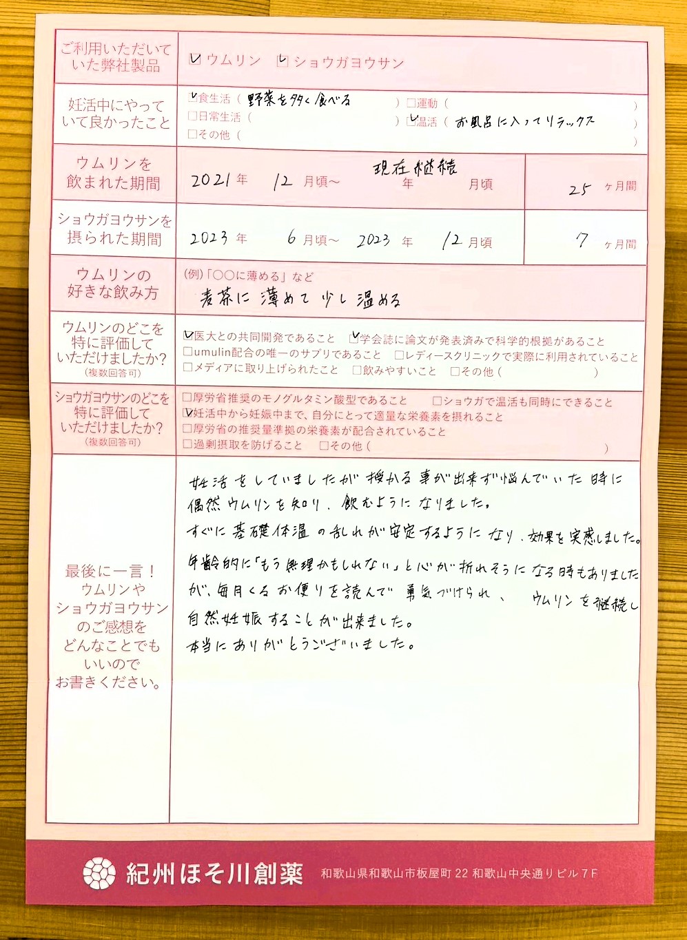 悩んでいた時に偶然ウムリンを知り、飲むようになりました。心が折れそうになる時もありましたが、毎月くるお便りを読んで勇気づけられ、ウムリンを継続しました。本当にありがとうございました。
