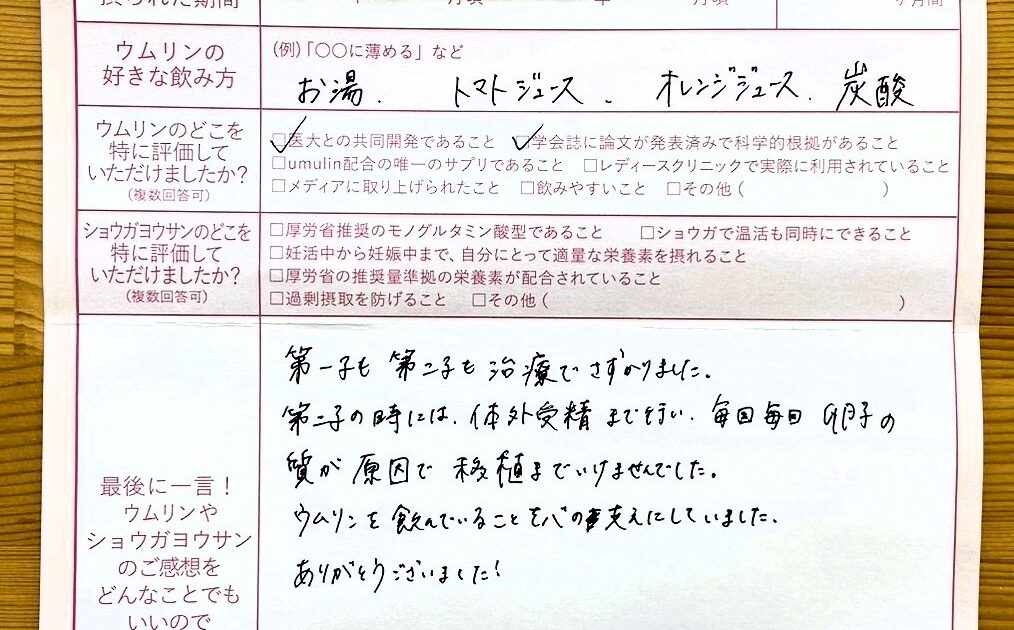 ウムリンはとても飲みやすく、続けやすかったです。ショウガヨウサンもしっかり飲んでいきたいと思っています。本当にお世話になりました。ありがとうございました!