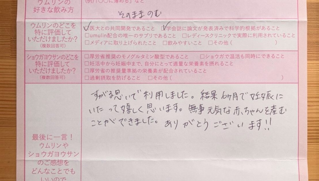 危機感をもち、わらにもすがる思いで、ウムリンをとりはじめました。スッパイもの好きな私は、おやつ感覚でそのままウムリンをのんでいました(笑)現在5ヶ月に入り、順調です。(夫も40代と高齢です)サプリやストレッチや食事も気に […]