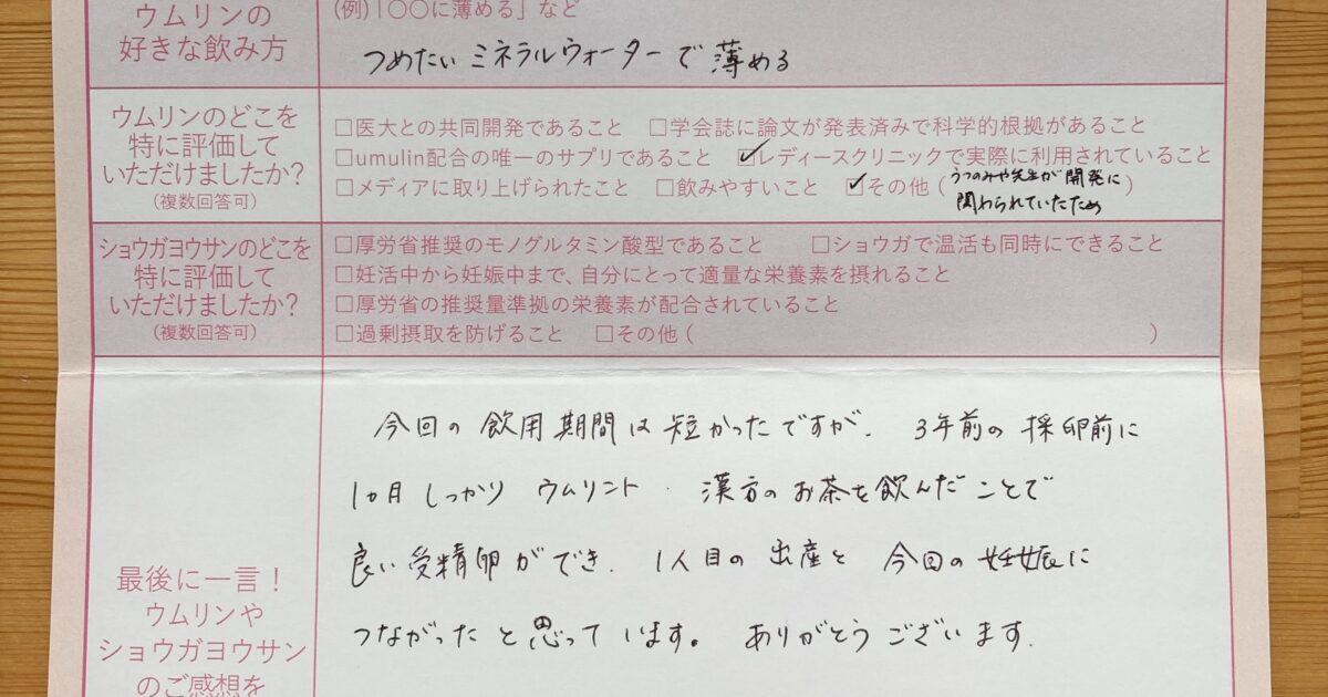 ウムリンを飲んでいて良かったなと思いました。 不安な時もありましたが、科学的根拠があると言われていたので信じて飲めていました。本当にありがとうございます。