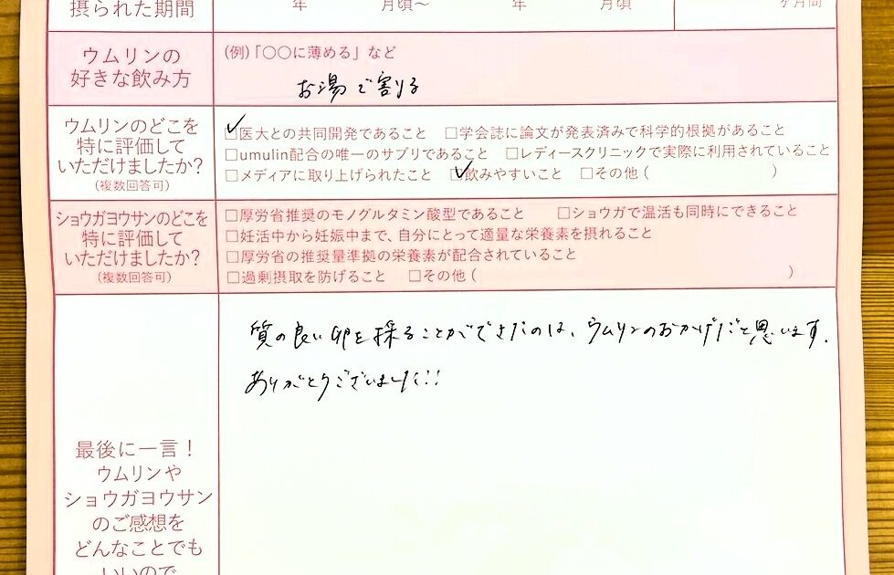 偶然見つけたウムリンを試してみることに…。まだしばらくウムリンとショウガヨウサンを続けてみたいと思っています。ありがとうございました!!