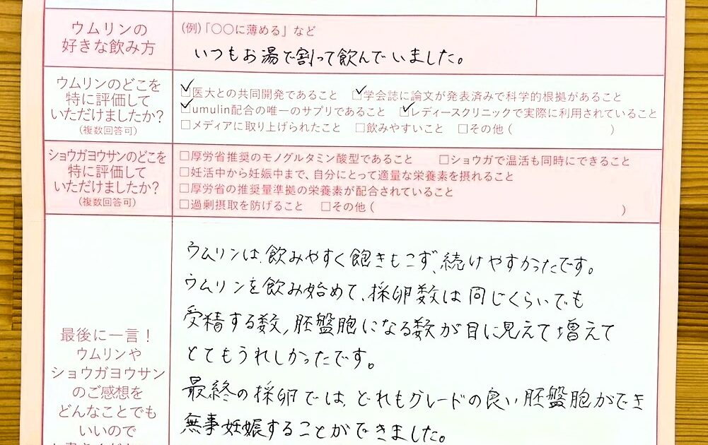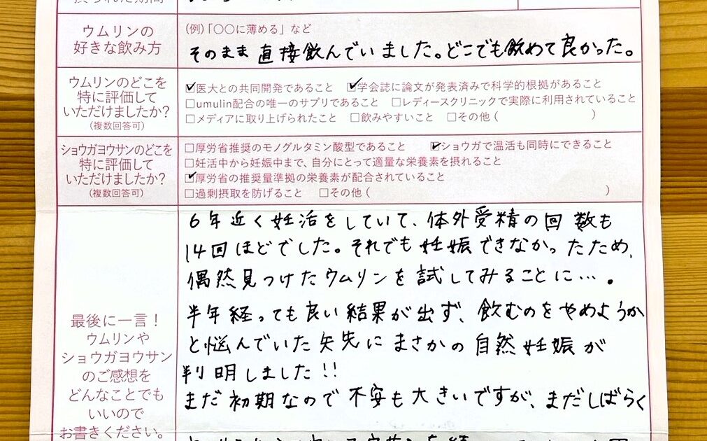 早く結果を出したいと焦っていたので、ウムリンを見つけて、金額的に高かったですが、とにかく出来るかぎりの事はやってみようと思い飲み始めました。不安や焦りでいっぱいになり精神的にとても辛かったのですが、ウムリンのメッセージを […]