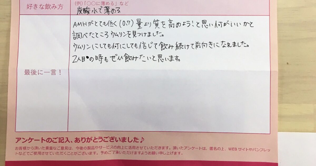 量より質を高めよう!と思い何がいいかと調べたところウムリンを見つけました。ウムリンにしても何にしても信じて飲み続けて前向きになれました。2人目の時もぜひ飲みたいと思います。