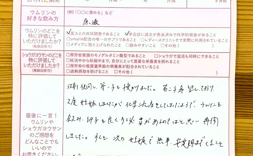 何かできることがないかとネットでいろいろ検索して、ウムリンに辿りつきました。早速、ショウガヨウサンと一緒に摂取することにしました。私の場合、43歳8ヶ月、ウムリン、ショウガヨウサンを飲み始めてこのタイミングだったのかもし […]
