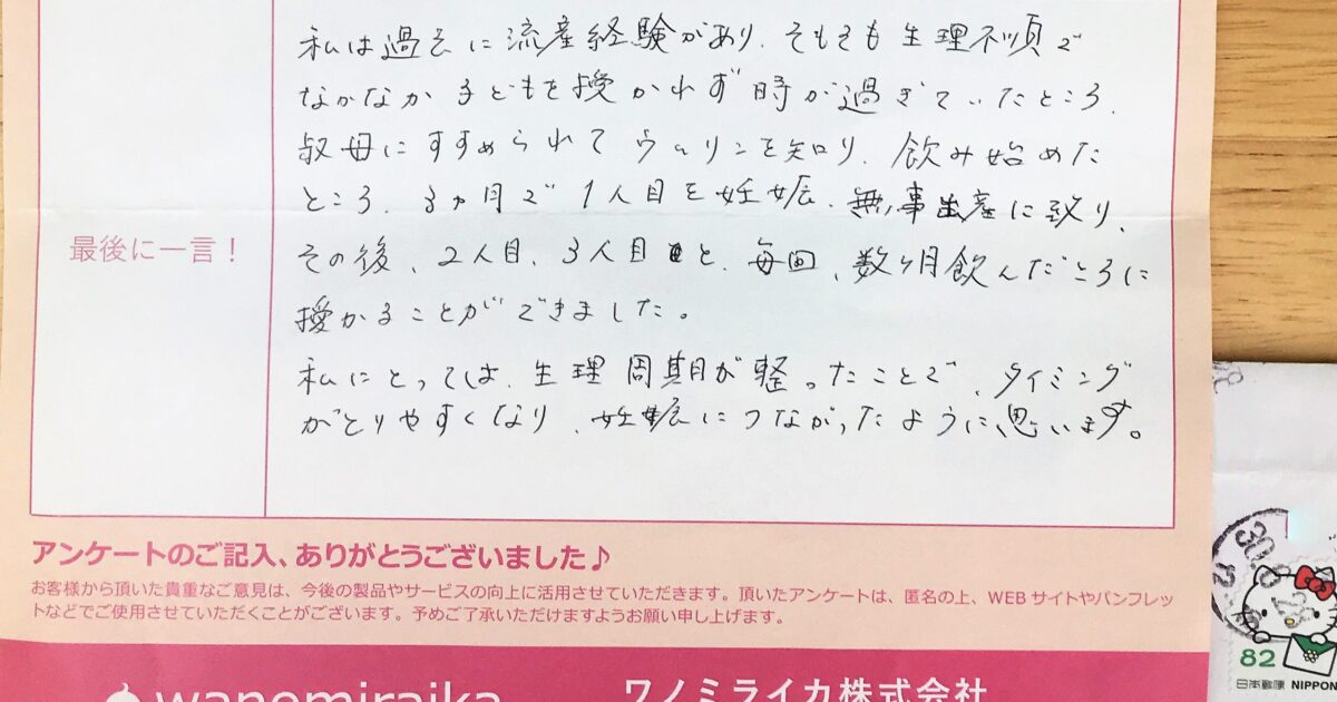 通院していましたが、この歳で自然妊娠できました。卵子や子宮にいいことを心がけてやった結果だと思います。