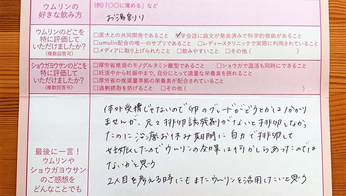 とても嬉しく思っています。今は悪阻中で仕事を休職しています。本当は続けて飲んでいたかったです。ウムリンさんにはとても感謝しています。