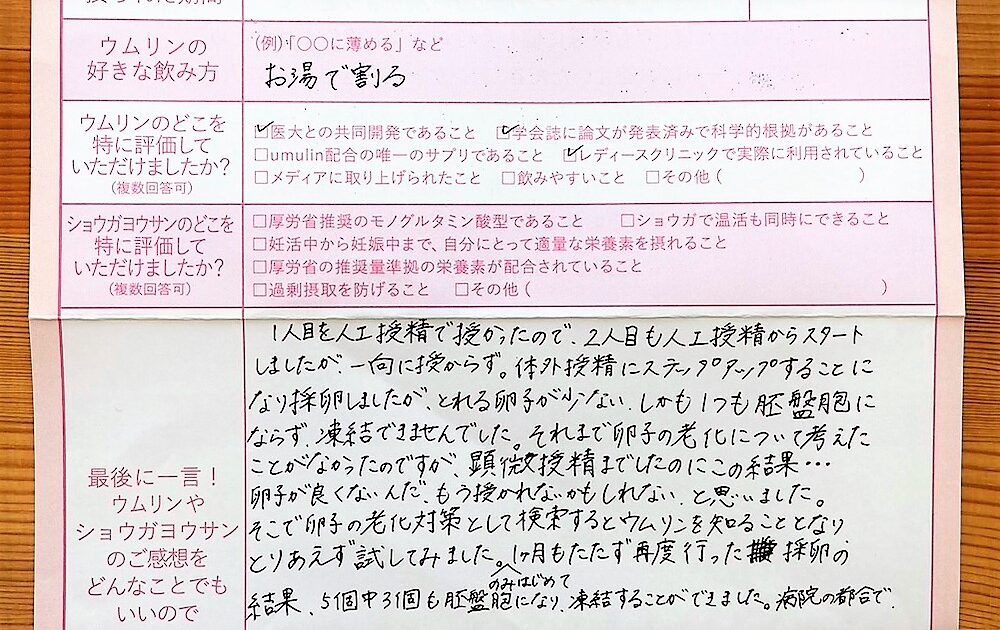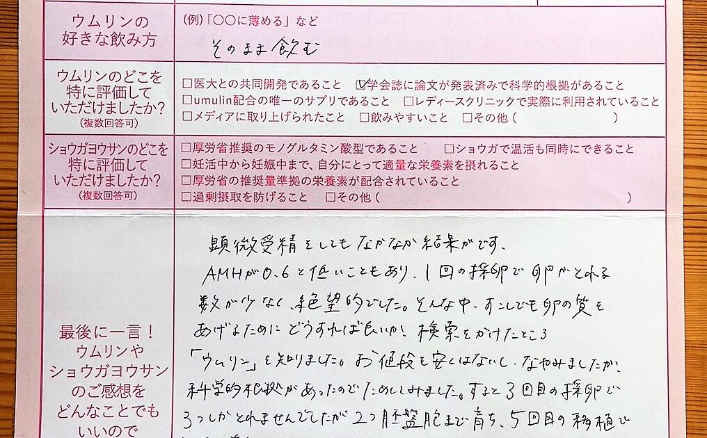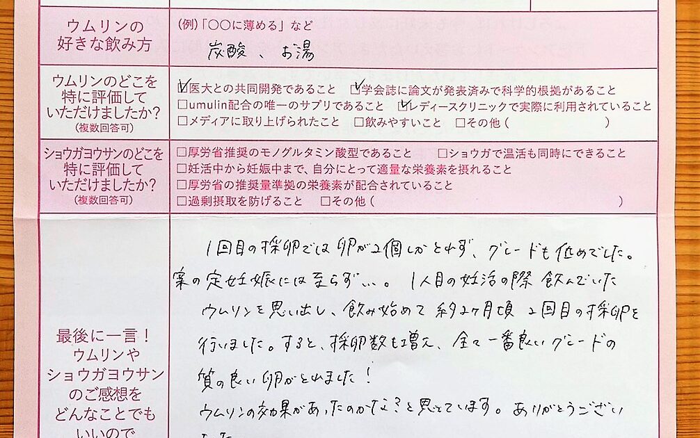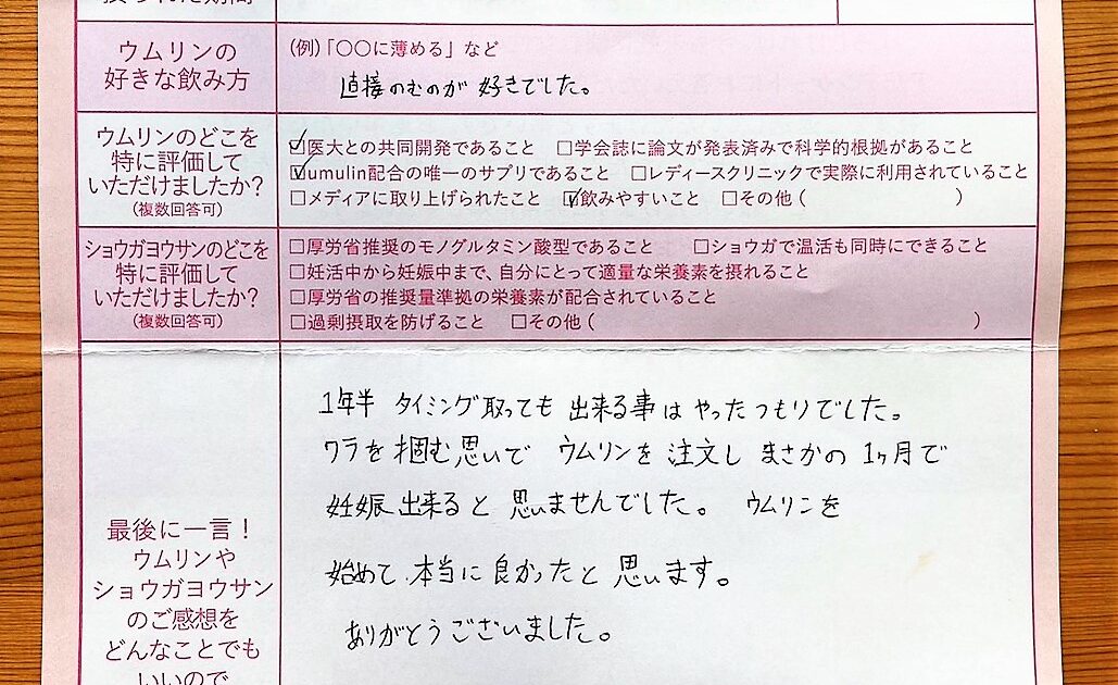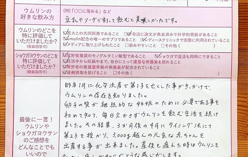 ウムリンの存在を知りました。毎日欠かさずウムリンを飲む生活を続けました。産後も疲れた時はウムリンを飲むと疲れが和らぐような感じがします。ウムリンには感謝しかありません!!また利用させて頂こうと思います。ありがとうございま […]