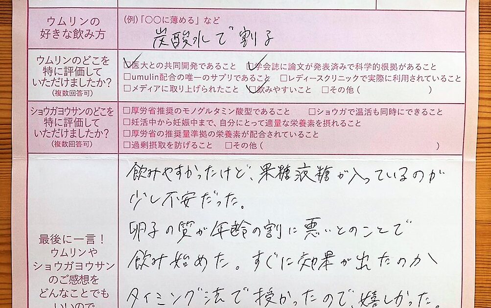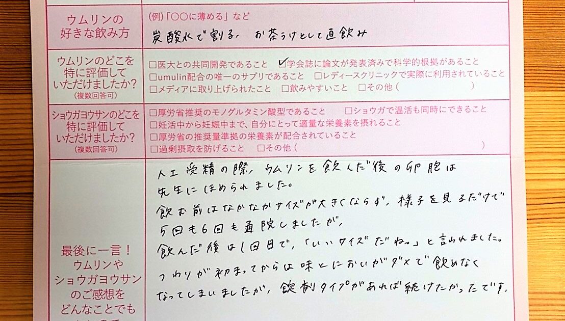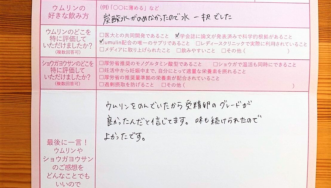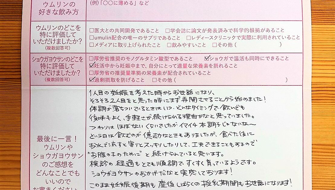 そろそろ考えないといけないのかなと思っていた時に出会ったのがウムリンでした。今回授かった命、お腹の中で10ケ月間大切に育てていきたいと思います。ありがとうございました。