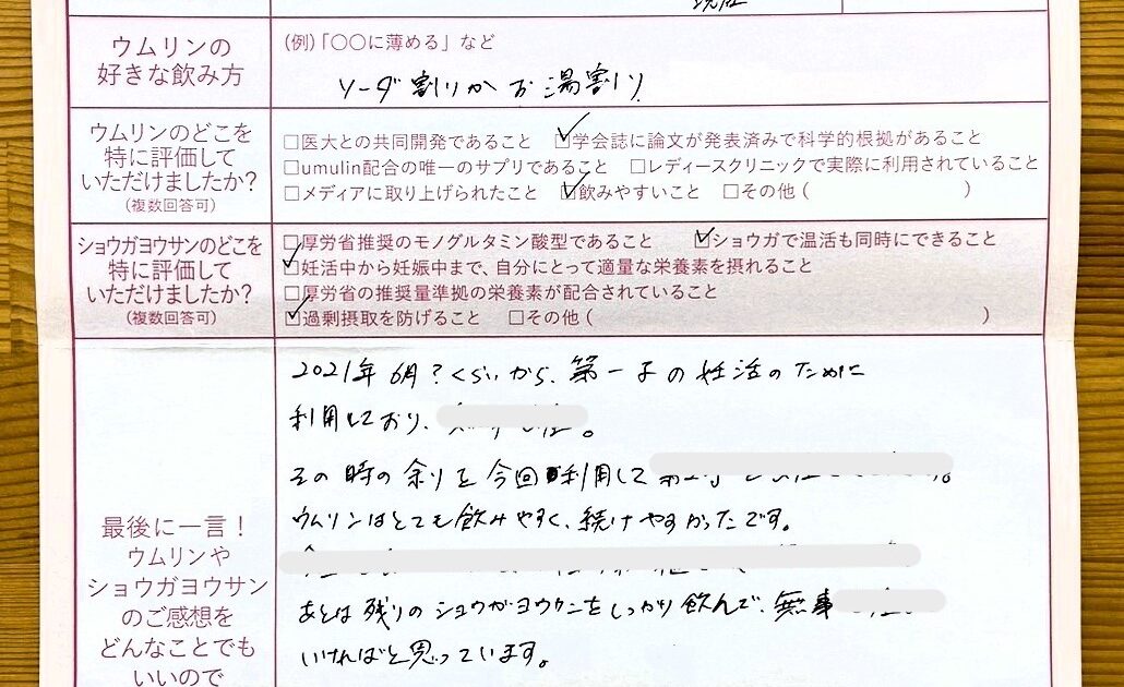 ウムリンはとても飲みやすく、続けやすかったです。ショウガヨウサンもしっかり飲んでいきたいと思っています。本当にお世話になりました。ありがとうございました!