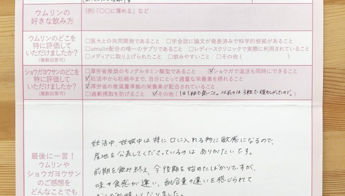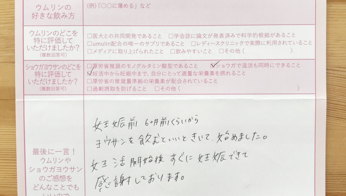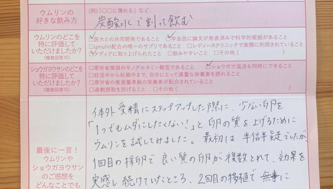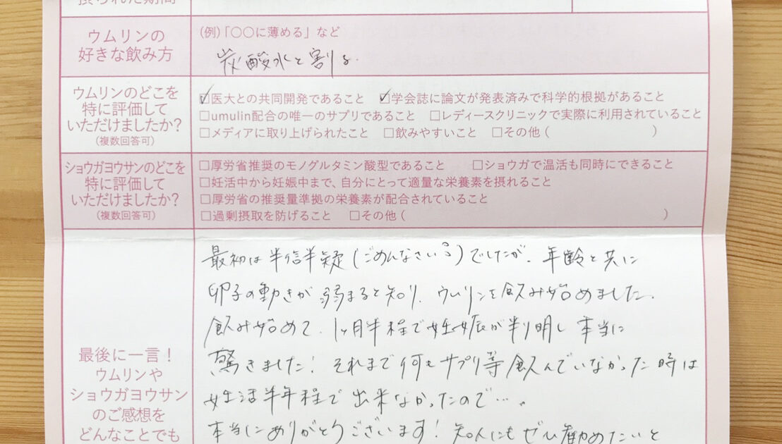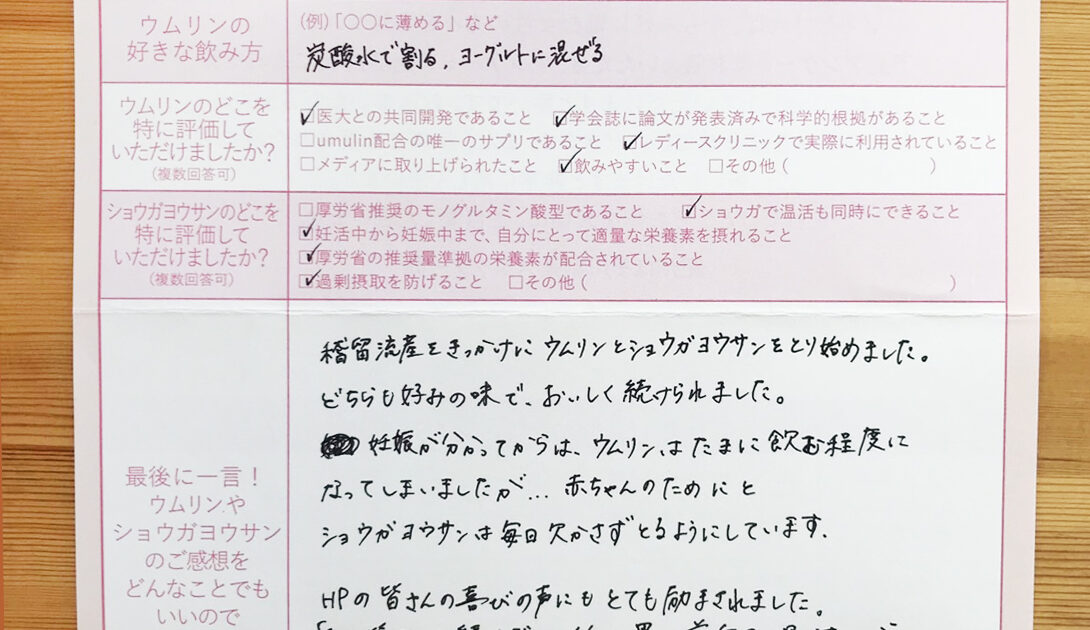 つわりでウムリンを飲めなくなり、今はストップしてしまっていますが、ウムリンのおかげだと思っています。本当にありがとうございます!