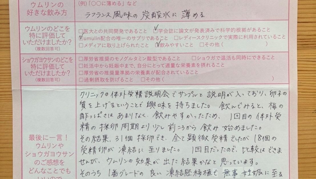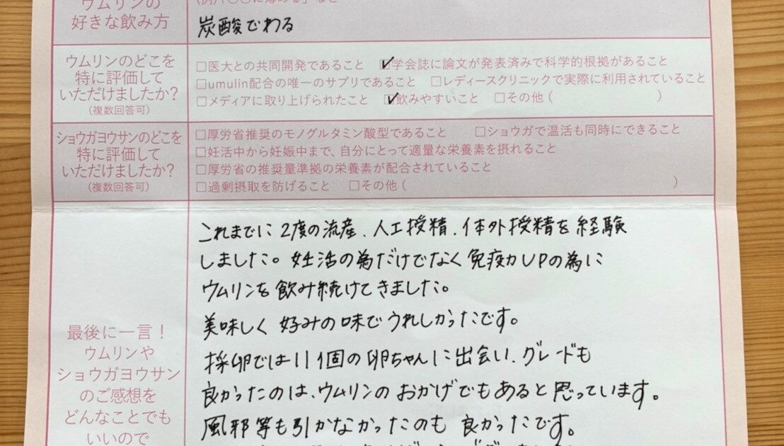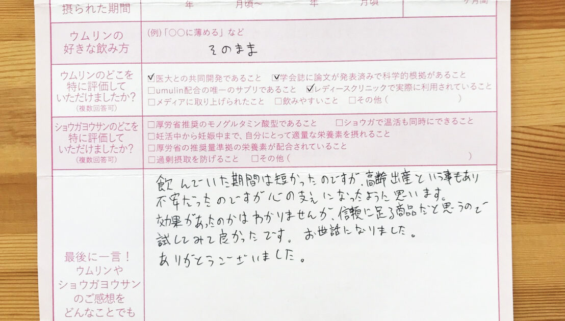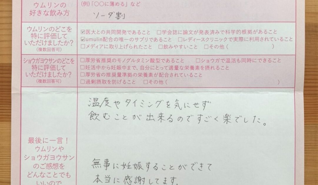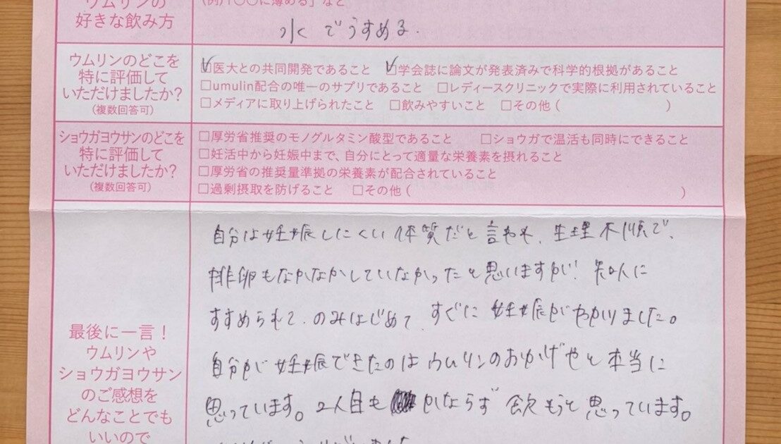 ウムリンのおかげやと本当に思っています。2人目もかならず飲もうと思っています。ありがとうございました。