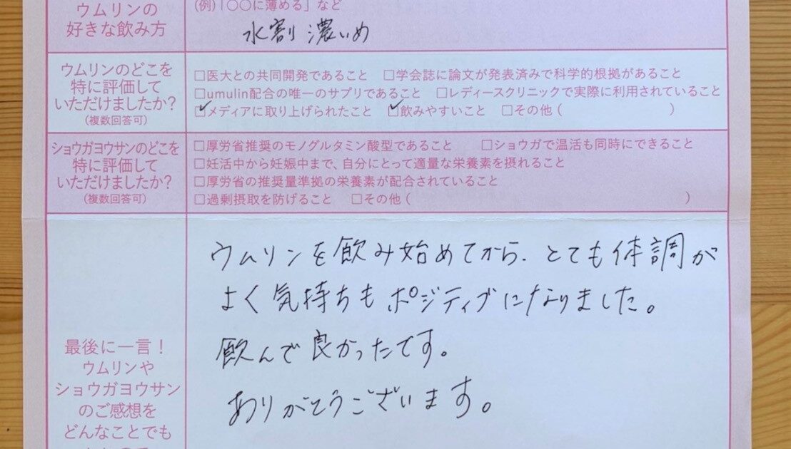 ウムリンを飲み始めてから、とても体調がよく気持ちもポジティブになりました。飲んで良かったです。ありがとうございます。