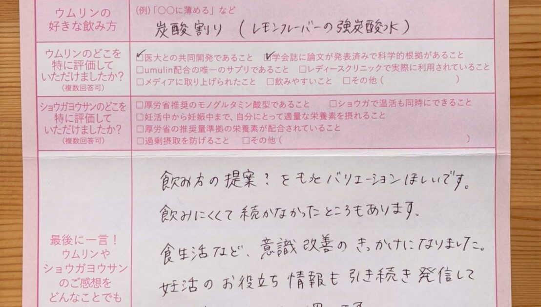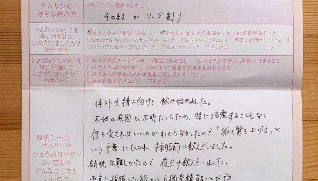 危機感をもち、わらにもすがる思いで、ウムリンをとりはじめました。スッパイもの好きな私は、おやつ感覚でそのままウムリンをのんでいました(笑)現在5ヶ月に入り、順調です。(夫も40代と高齢です)サプリやストレッチや食事も気に […]