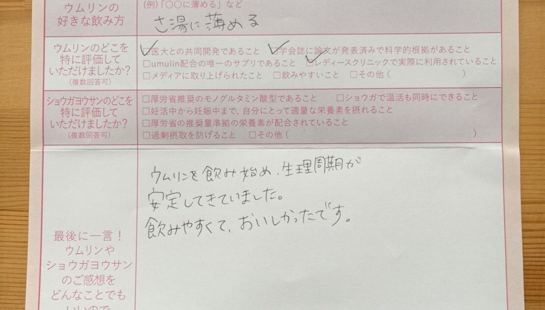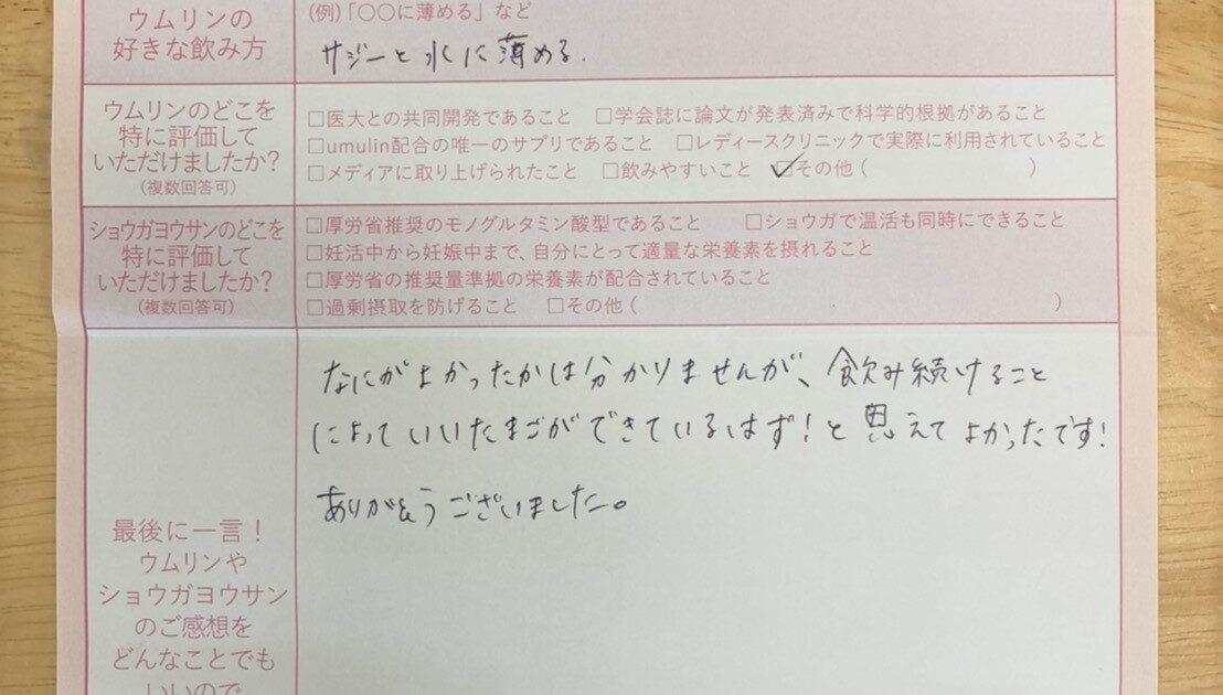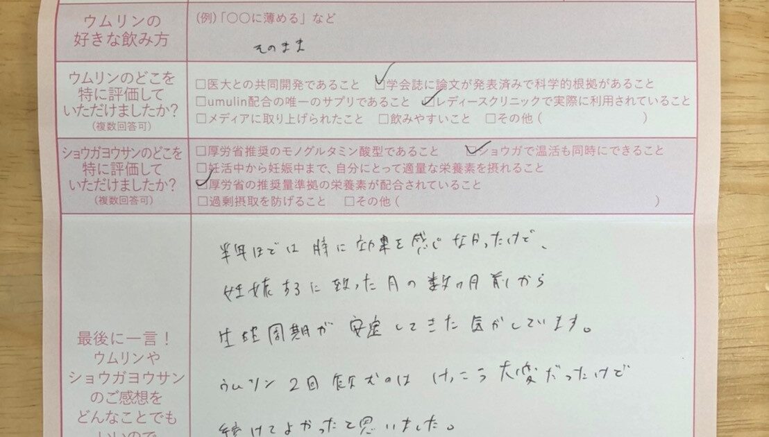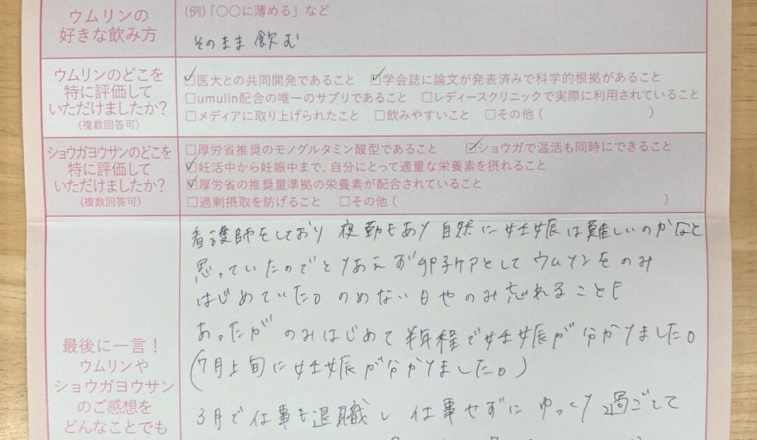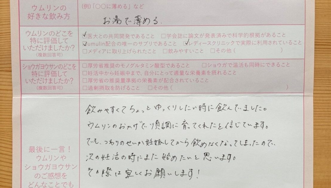 飲みやすくてちょっとゆっくりしたい時に飲んでました。 ウムリンのおかげで順調に育ってくれたと信じています。 でも、つわりのせいか飲めなくなってしまったので次にまた始めたいと思います。 その際は宜しくお願いします!