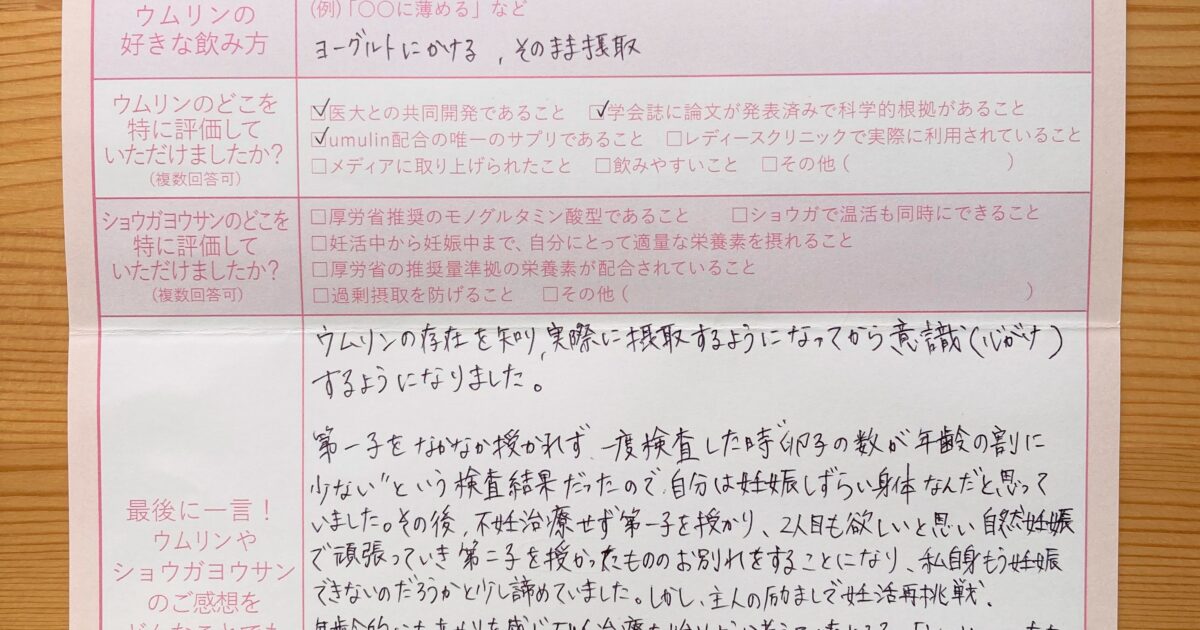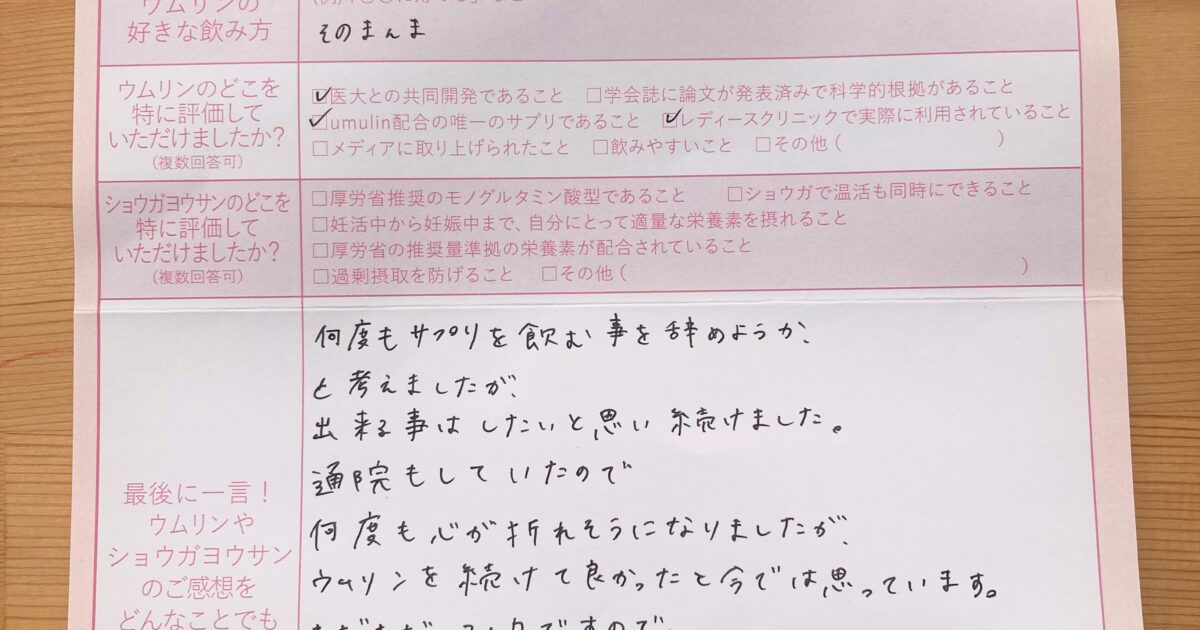 何度もサプリを飲む事を辞めようか、と考えましたが、出来る事はしたいと思い続けました。 通院もしていたので何度も心が折れそうになりましたが、ウムリンを続けて良かったと今では思っています。 まだまだ3ヶ月ですので気を付けなが […]