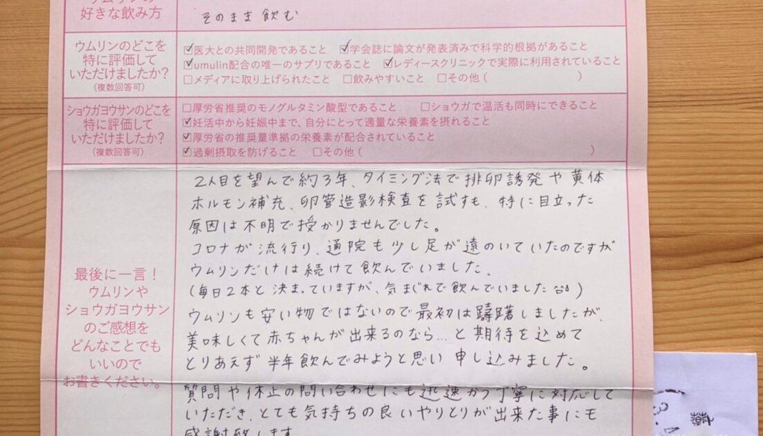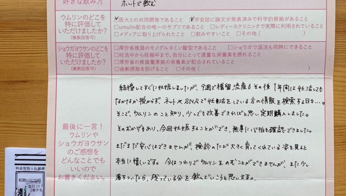 葉酸の吸収を良くするということもあり、妊娠が分かってからもしばらく飲んでいました。 無事心拍も確認でき幸せな気持ちになっています。 ウムリンに出会い続けてよかったです!ありがとうございました。