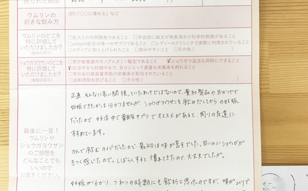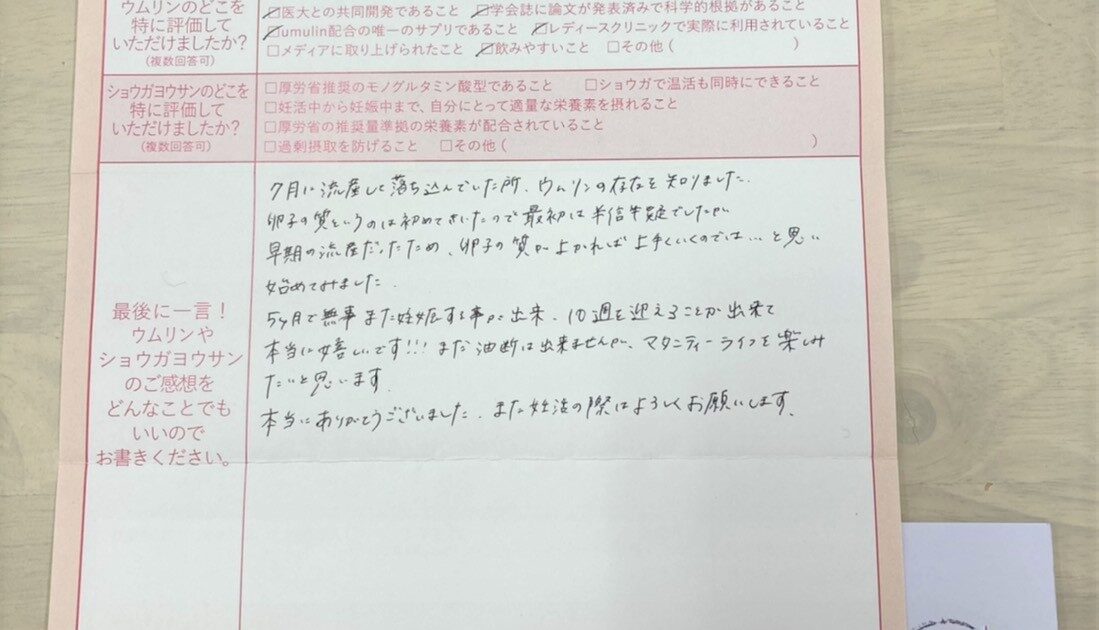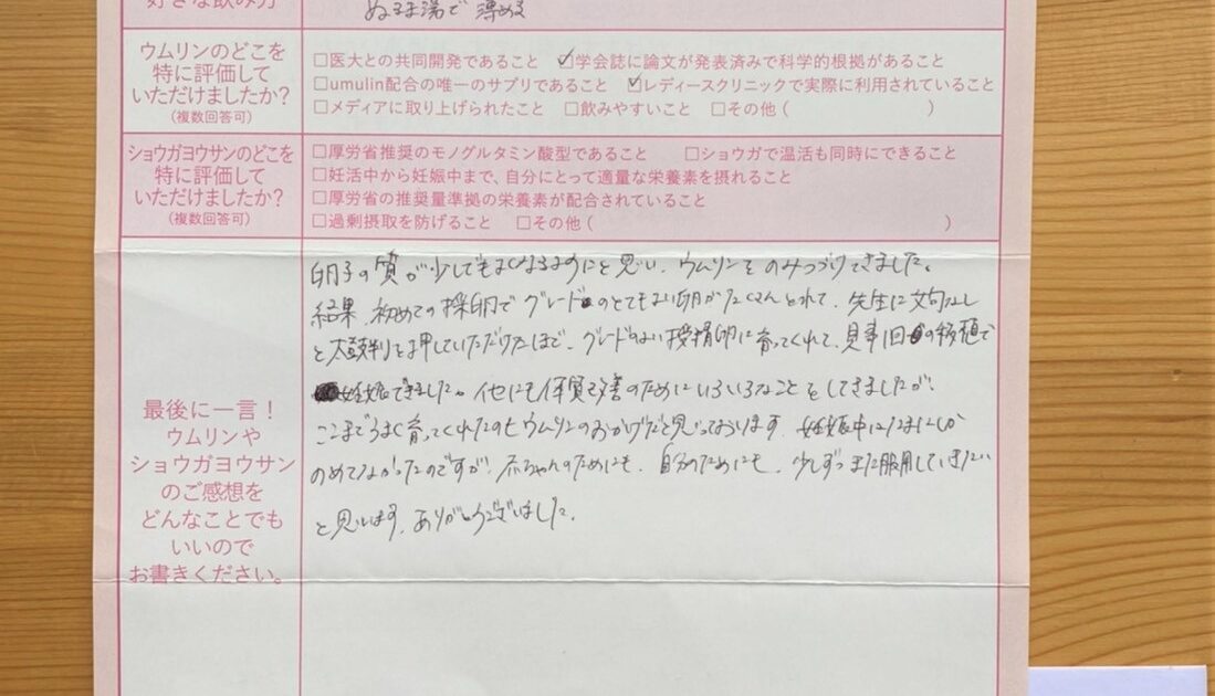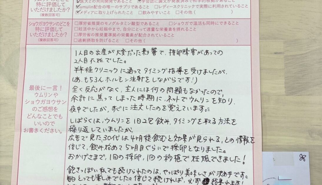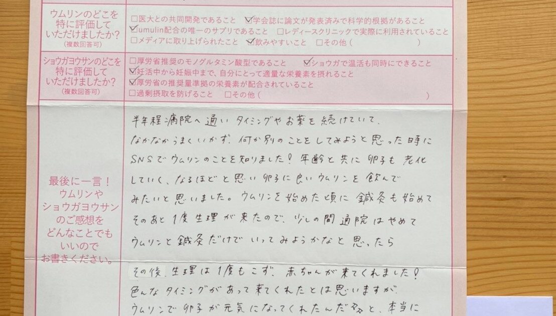 タイミングやお薬を続けていてなかなかうまくいかず、何か別のことをしてみようと思った時にSNSでウムリンのことを知りました!