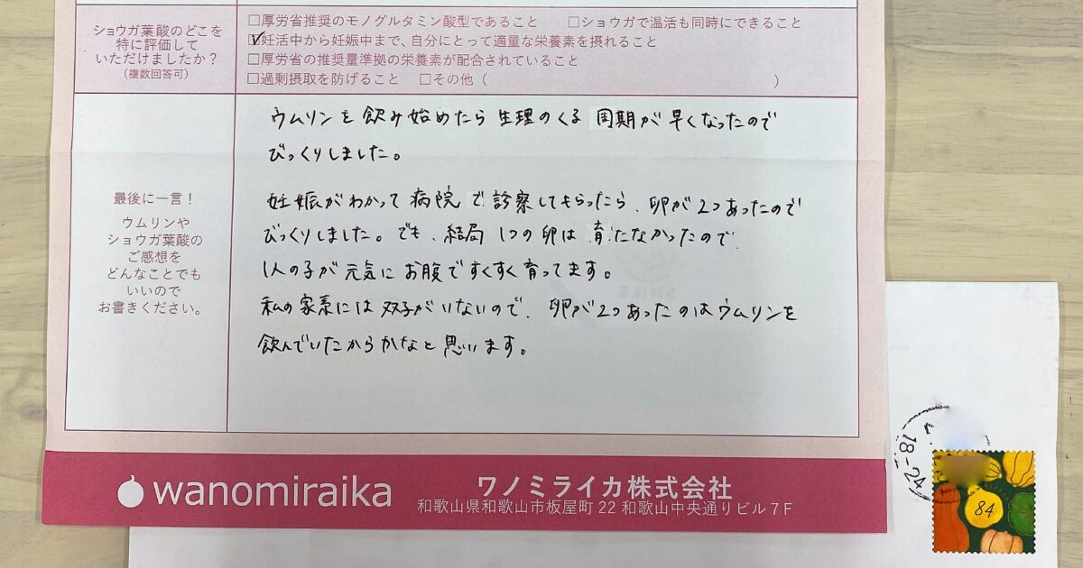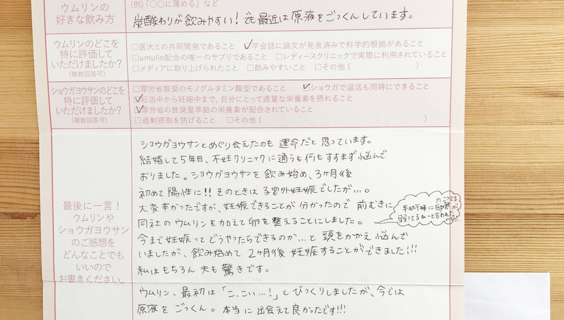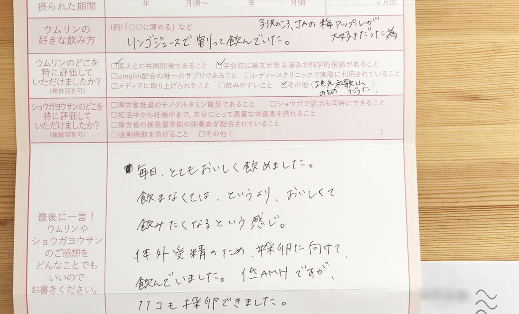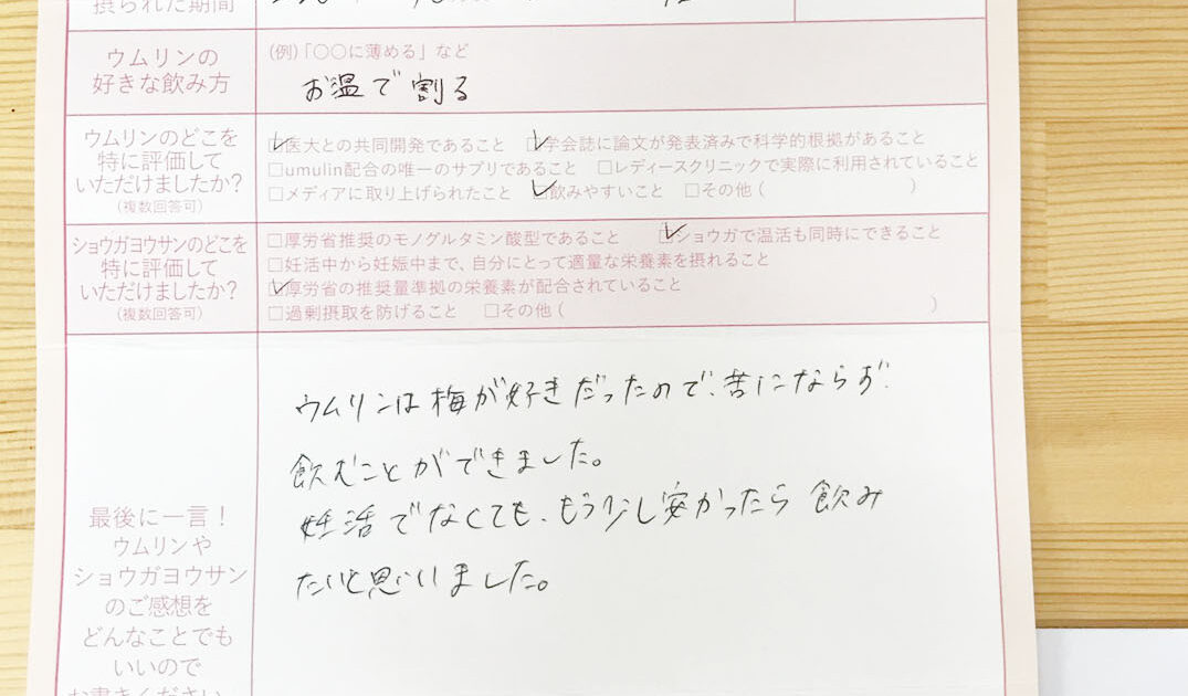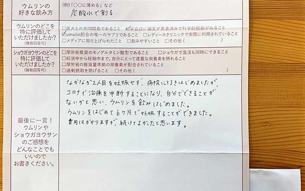 少し焦りを感じていた頃に偶然SNSで見つけたウムリンを試してみようと思い、飲み始めました。何かせずにはいられなかったので、他にも葉酸サプリや身体を温めるお茶を飲んだりと色々試しましたが、ウムリンの味が好きだったこともあり […]