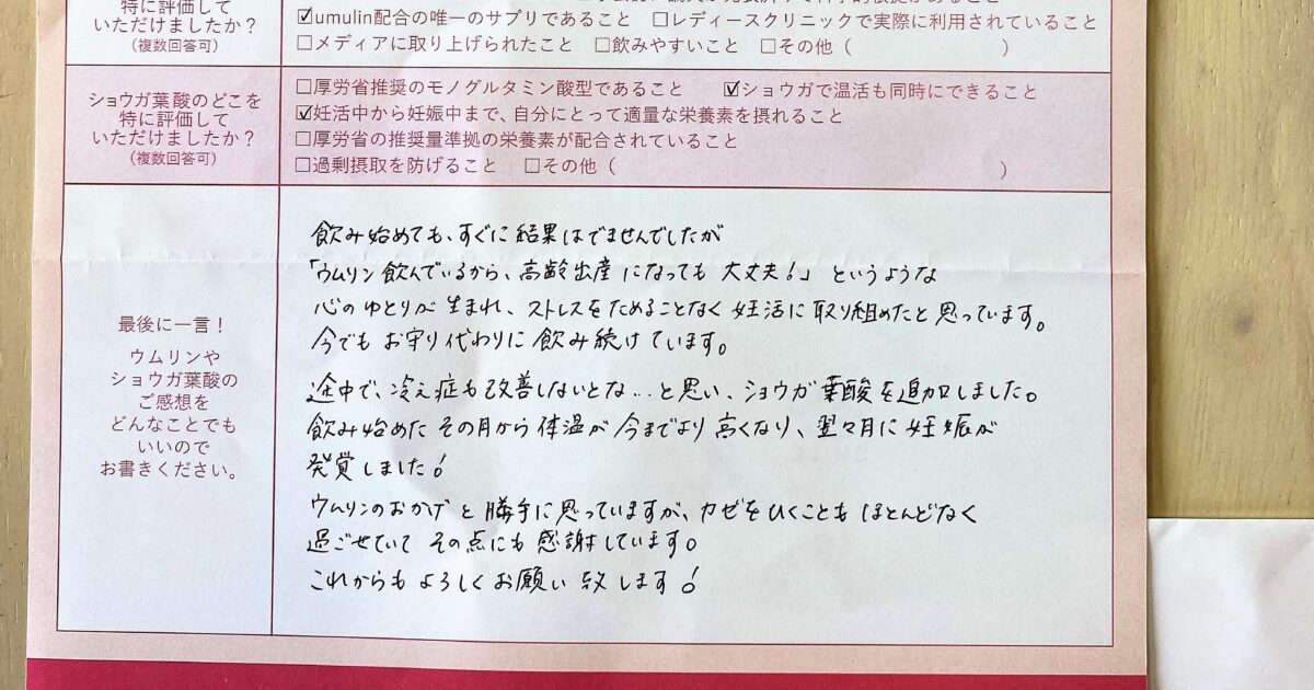 30歳からの妊活だったので、なるべく早く第1子が欲しかった。大変感謝しています!