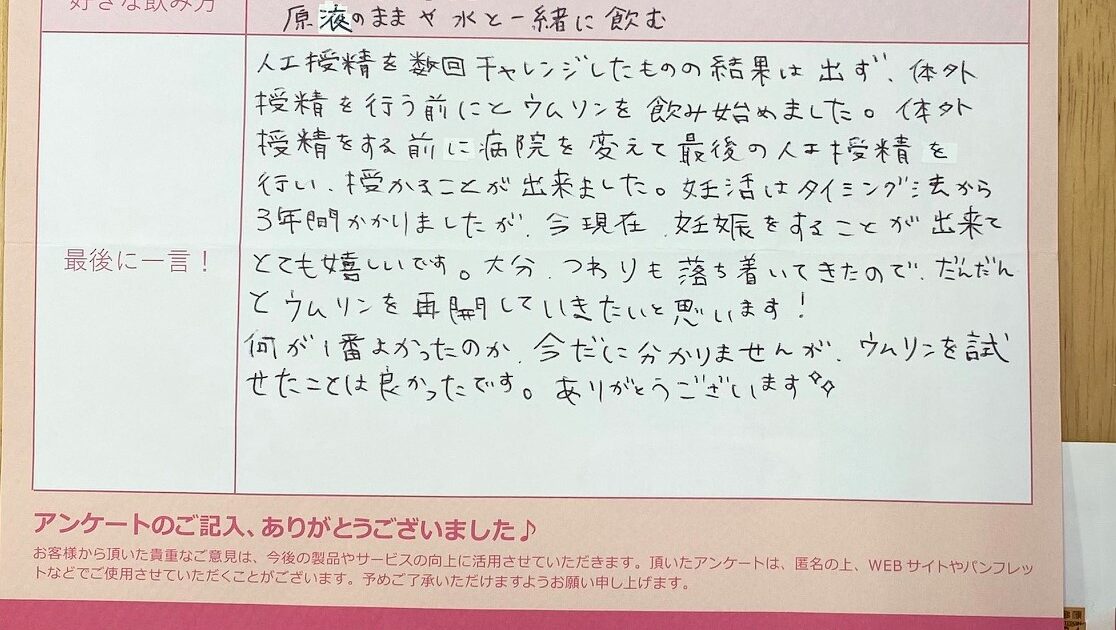 結婚して6年以上の妊活の中で、いちども成功できずずっと悲しい思いをしていました。 ありがとうございました。