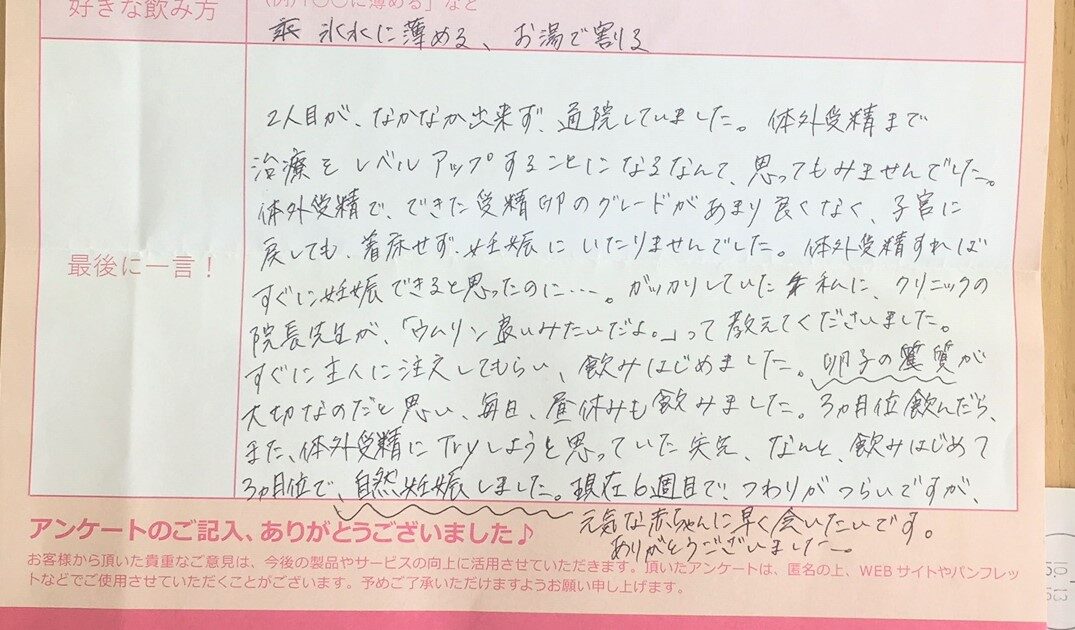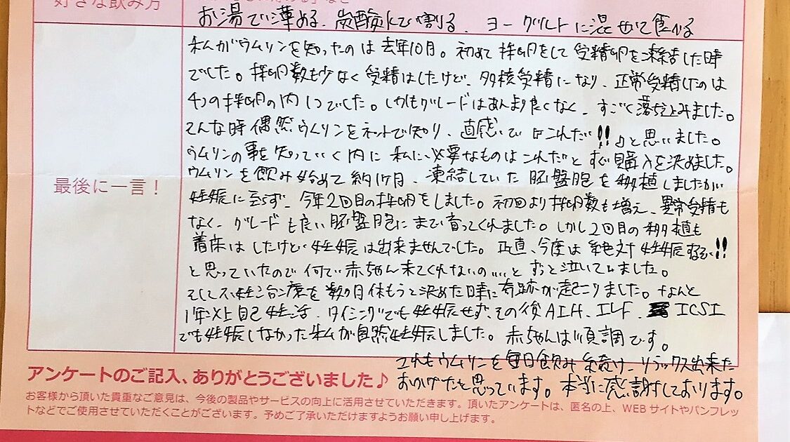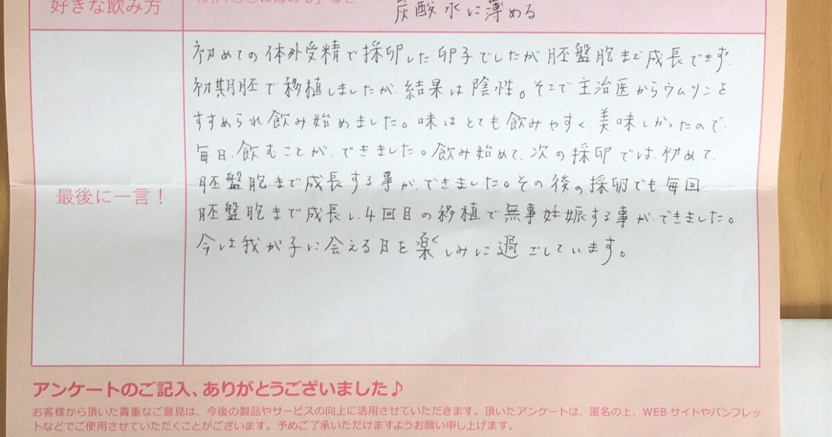 初めての体外受精で採卵した卵子でしたが結果は陰性。ウムリンの味はとても飲みやすく美味しかったので毎日飲むことができました。次の採卵では初めて胚盤胞まで成長する事ができました。4回目の移植で無事できました。今は我が子に会え […]