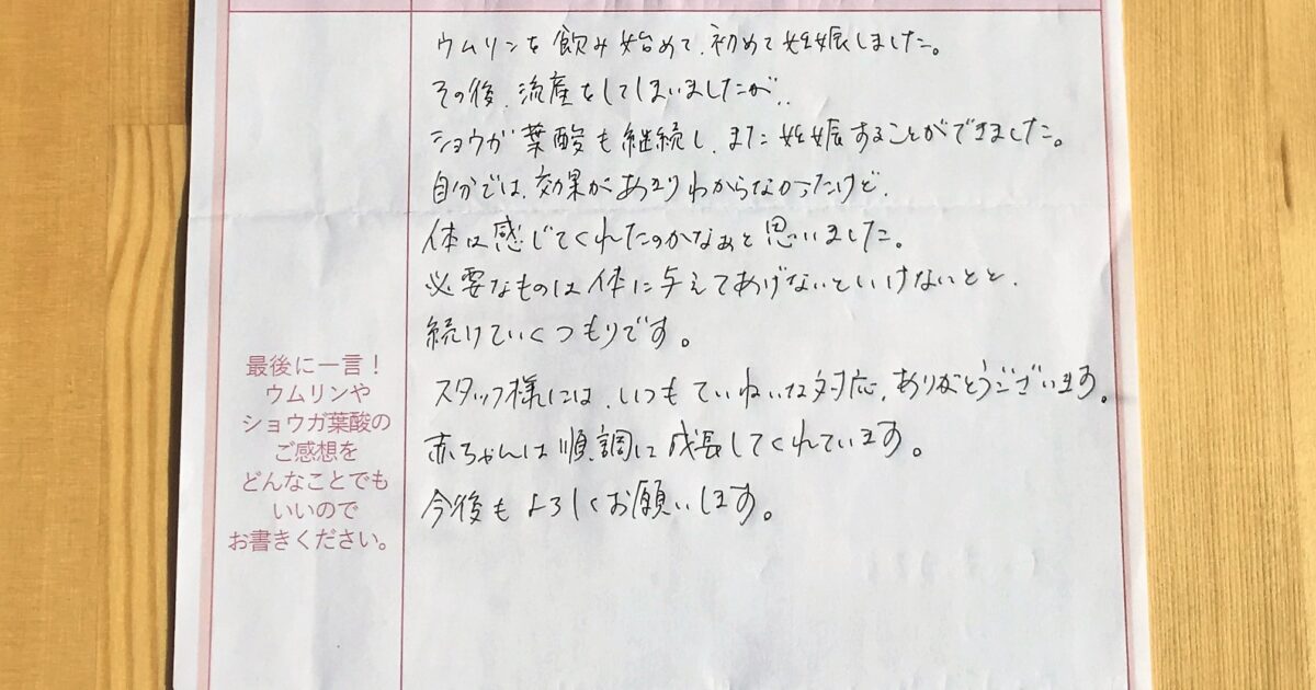 初めて妊娠しました。その後、流産してしまいましたが、また妊娠する事ができました。スタッフ様にはいつもていねいな対応、ありがとうございます。赤ちゃんは順調に成長してくれています。今後もよろしくお願いします。