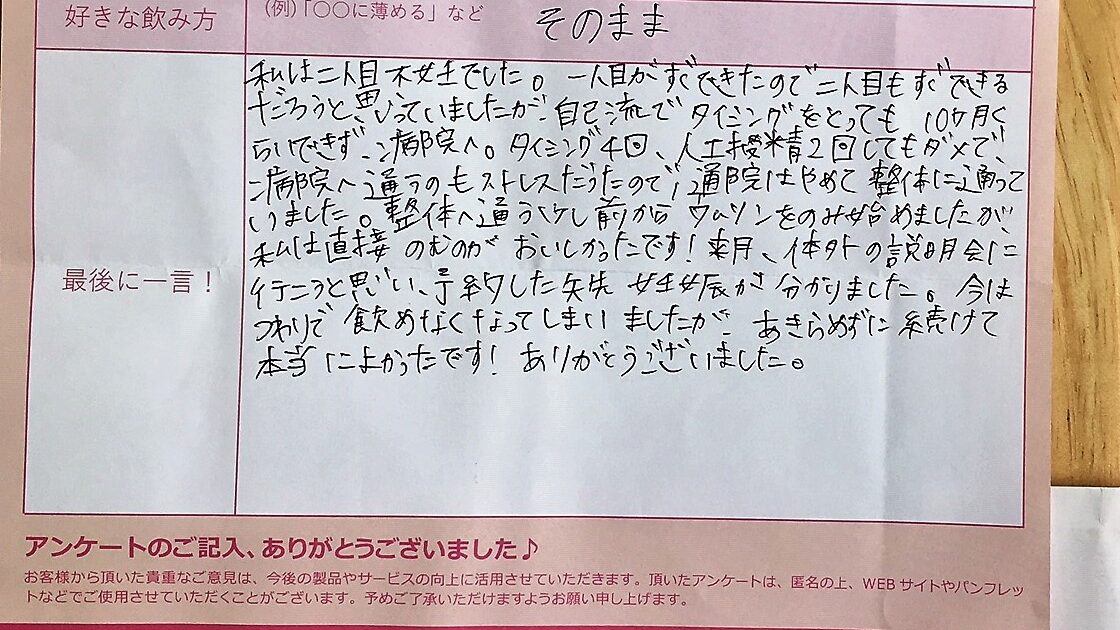 寒い時期にホットで飲めたのがとても助かりました!梅の酸味とか好みの味だったので続けることができたのでよかったです。妊活!妊活!!と気負いせずに休止も楽にできて精神的にもリラックスして待てたんだと思います。