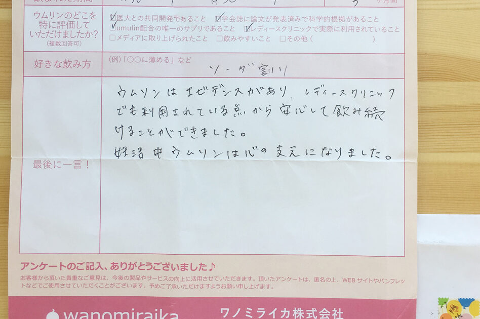 ウムリンはエビデンスがあり、レディースクリニックでも利用されている点から安心して飲み続けることができました。 妊活中ウムリンは心の支えになりました。