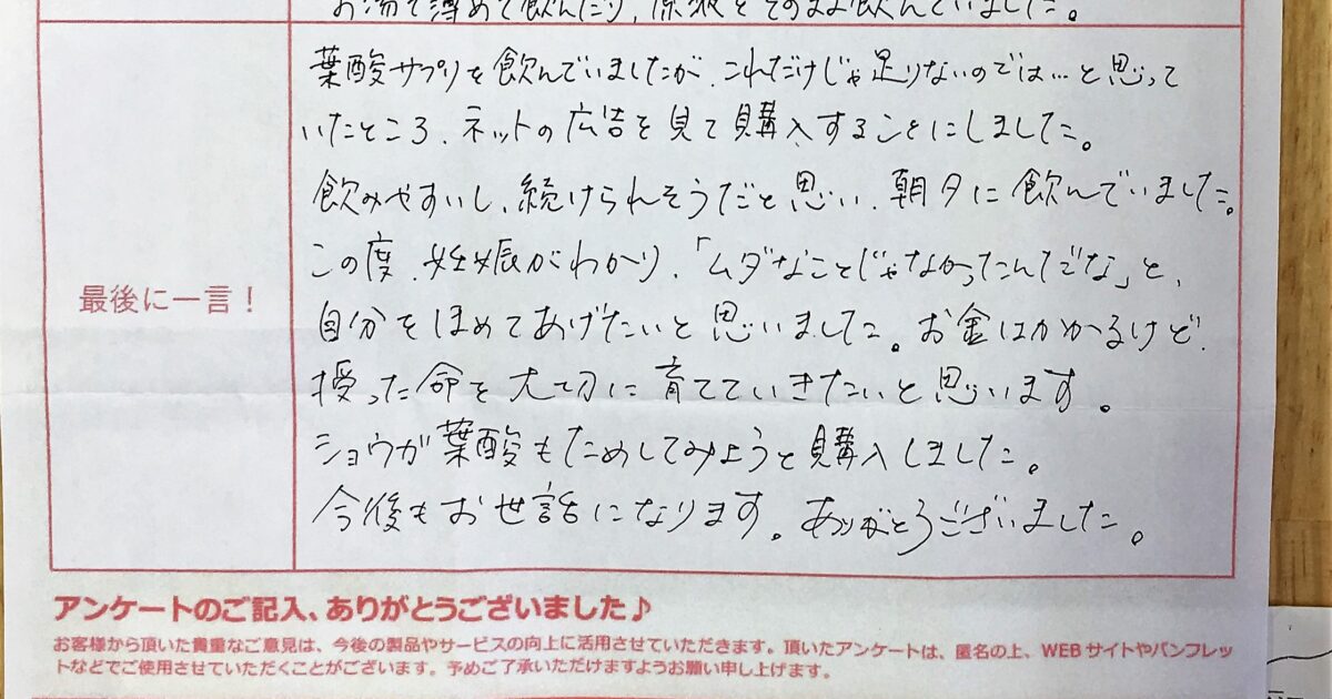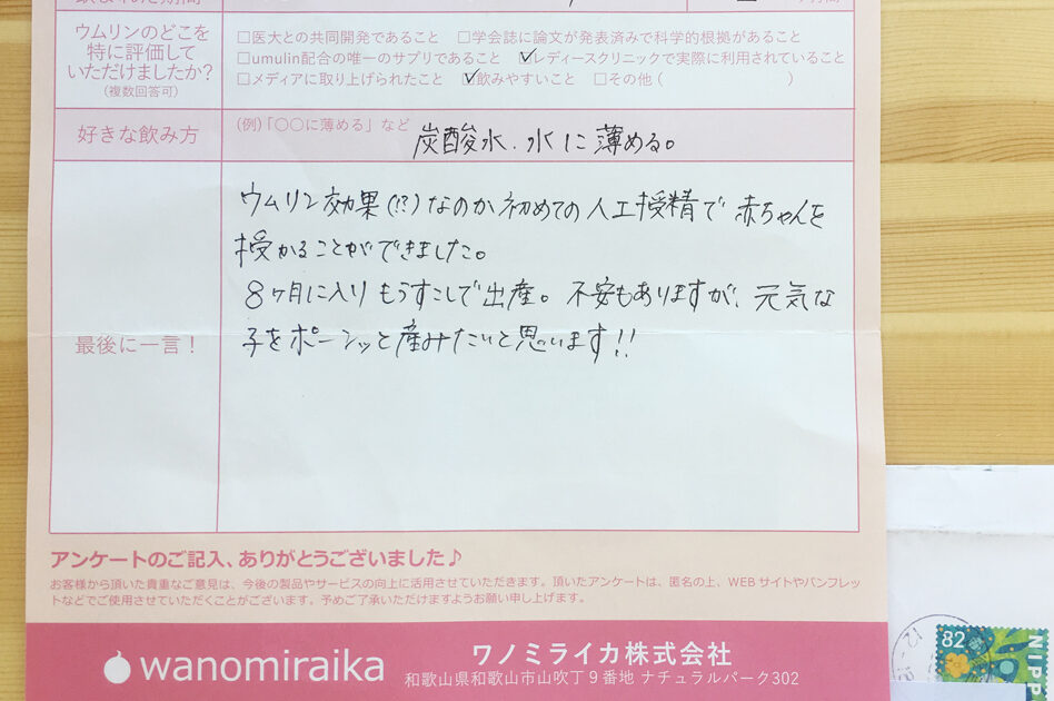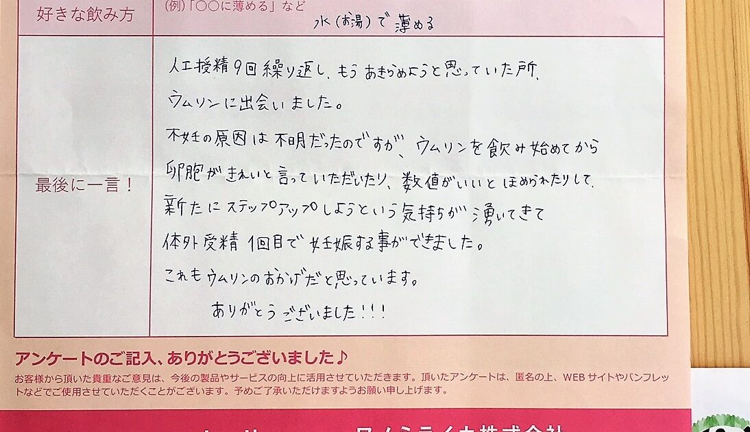妊娠できてよかった。ウムリンを飲んでいたおかげかはわからないけど、続けててよかったと思う。