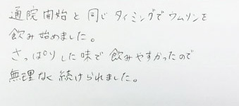 通院開始と同じタイミングでウムリンをウムリンを飲み始めました。さっぱりした味で飲みやすかったので無理なく続けられました。