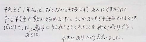 卵子の質を上げたいと思い飲み始めました。これから出産まで大事に過ごします。ありがとうございました。