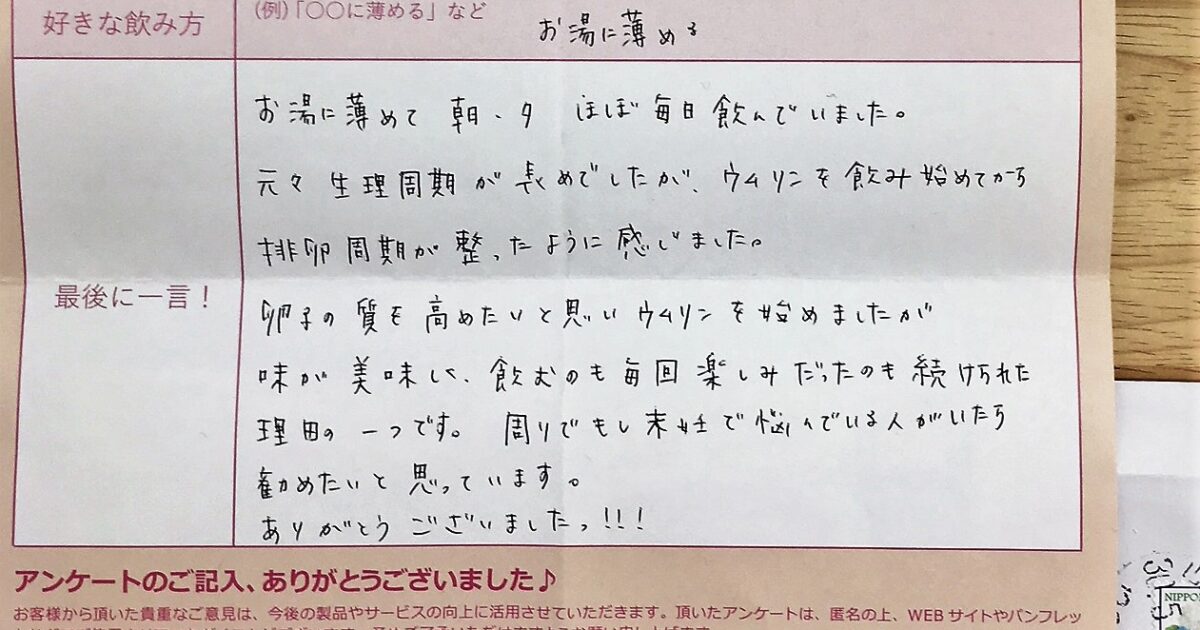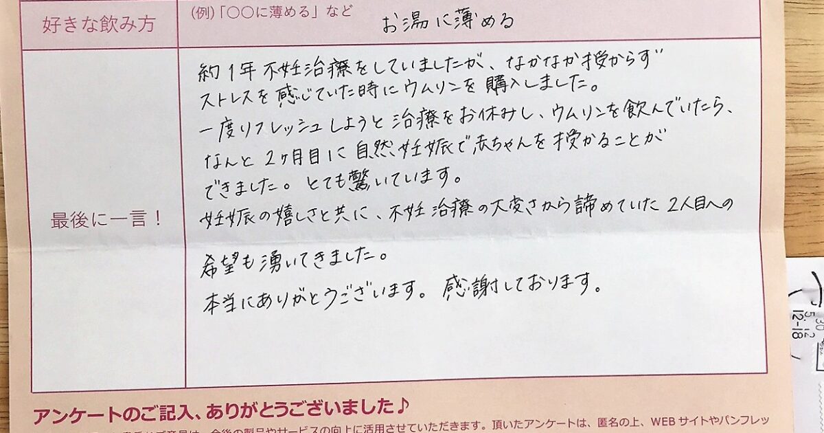 ウムリンを飲みはじめて、なんとなく気持ちを強く持って妊活することができました!今はつわりで毎日は飲めていませんが、飲める時に飲み続けて無事出産したいです。これからもよろしくお願いします!!